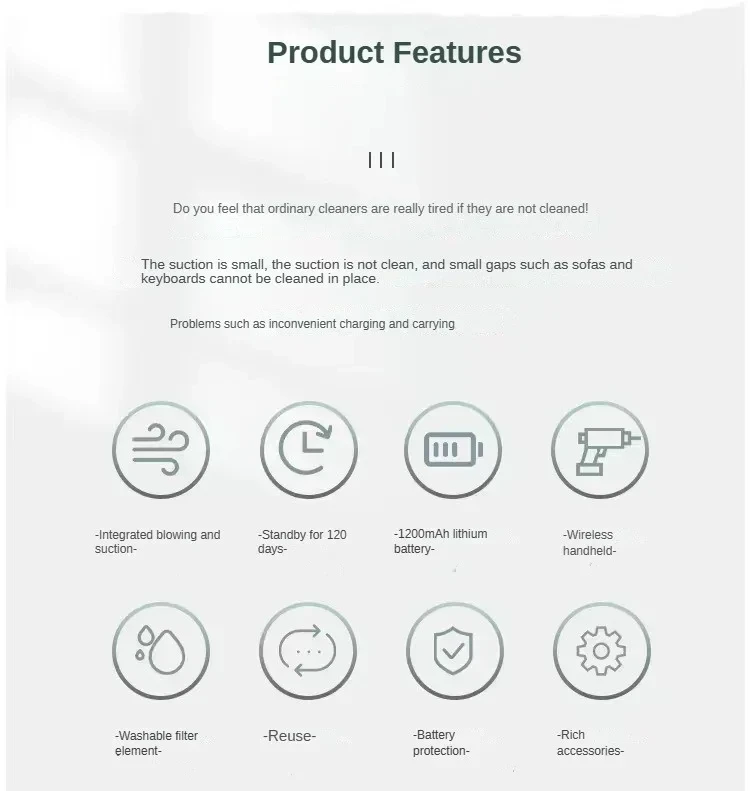 5. Accessories: charging cable, long flat mouth, brush, blow nozzle.
